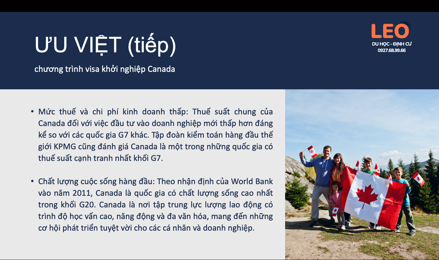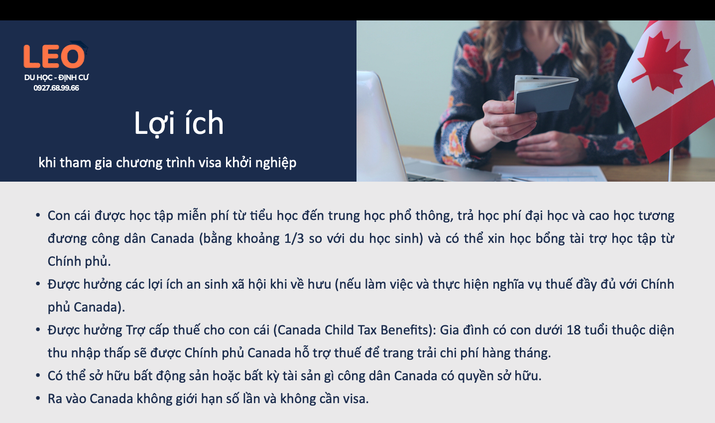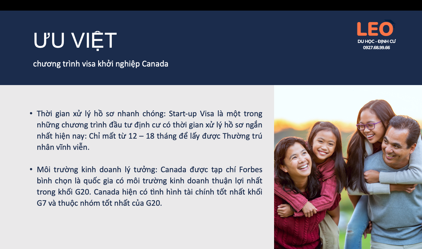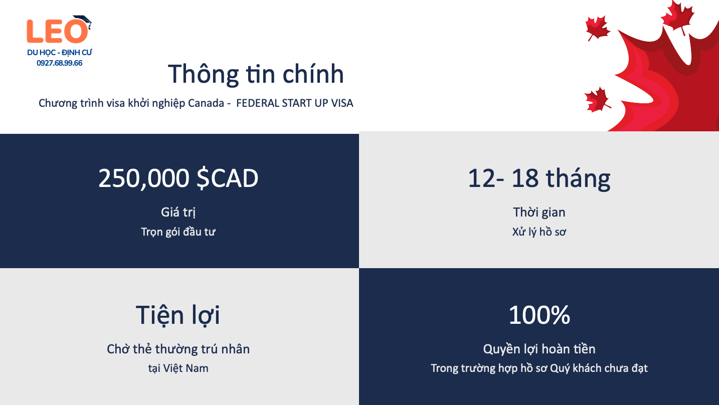 Cơ hội ĐỊNH CƯ tại CANADA chưa bao giờ lại thuận lợi, dễ dàng và chi phí phải chăng đến thế! Gói ĐẦU TƯ KHỞI NGHIỆP - START UP VISA sẽ giúp cả gia đình bạn có thẻ xanh để định cư lâu dài tại xứ sở lá phong lý tưởng hàng đầu thế giới.