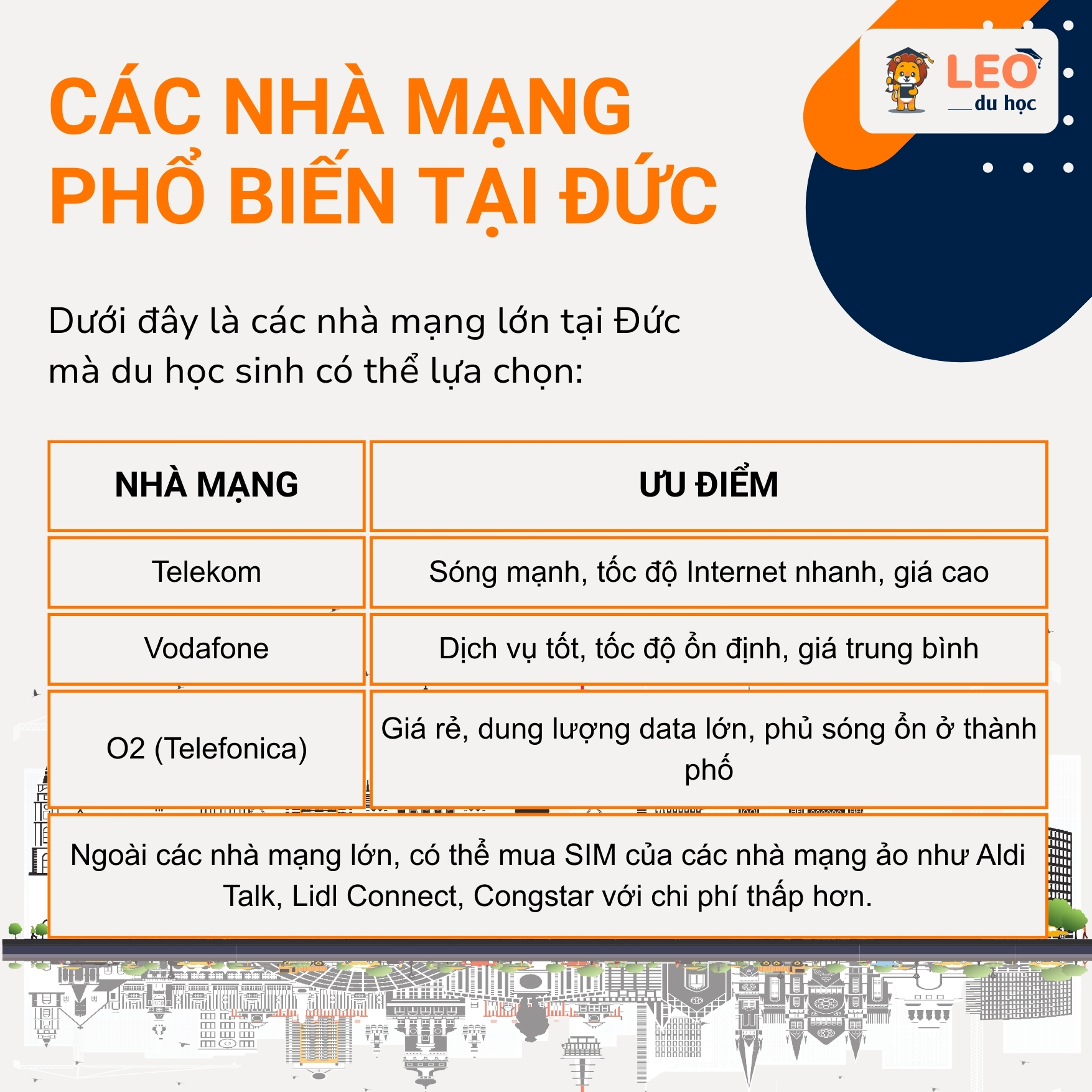 Ngoài ba nhà mạng lớn, du học sinh thường chọn các nhà mạng ảo như Aldi Talk, Lidl Connect hoặc Congstar để tiết kiệm chi phí.