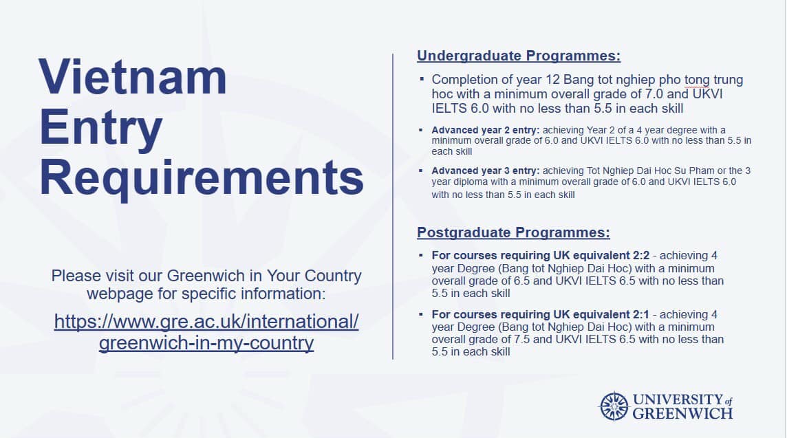 - PG: TN Đại học, GPA trên 6.5 UKVI IELTS 6.0 with no less than 5.5 in each skill