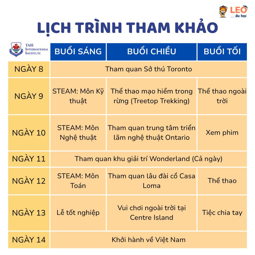 Tổng chi phí trại hè Canada 2026 tại TAIE là 5.650 CAD, đã bao gồm ăn ở, bảo hiểm và toàn bộ chi phí tham quan. Phí ghi danh là 150 CAD. Thời hạn đăng ký chương trình kéo dài đến ngày 15/03/2026, tuy nhiên số lượng chỗ có hạn và thường được lấp đầy sớm.