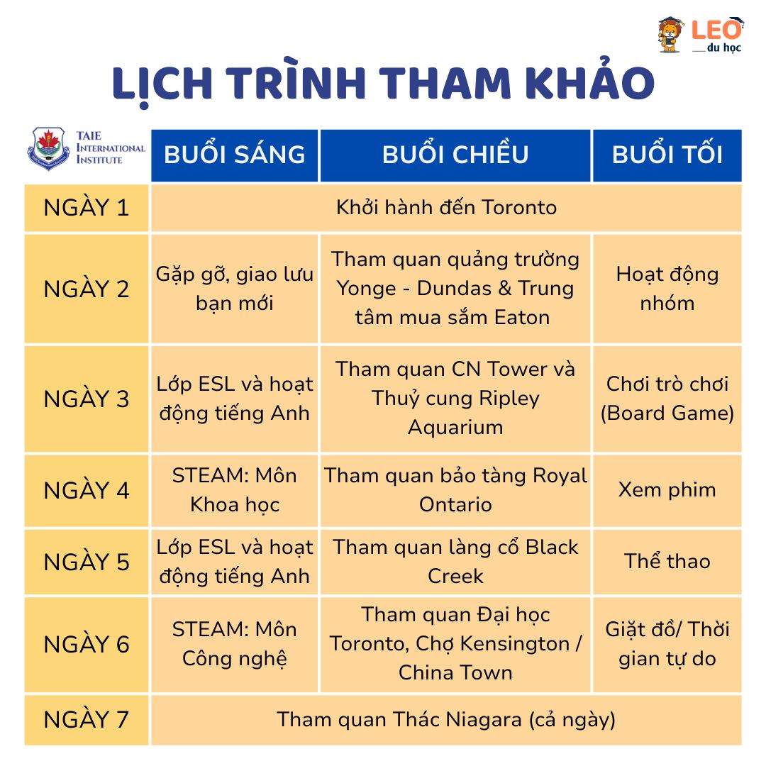 Bên cạnh học tập, học sinh được tham quan và khám phá toàn bộ Toronto, từ tháp CN Tower biểu tượng, thác Niagara hùng vĩ đến khu vui chơi Wonderland và chuyến tham quan Đại học Toronto danh tiếng. Đây là cơ hội để các em làm quen với văn hóa, môi trường sống và hệ thống giáo dục Canada.
