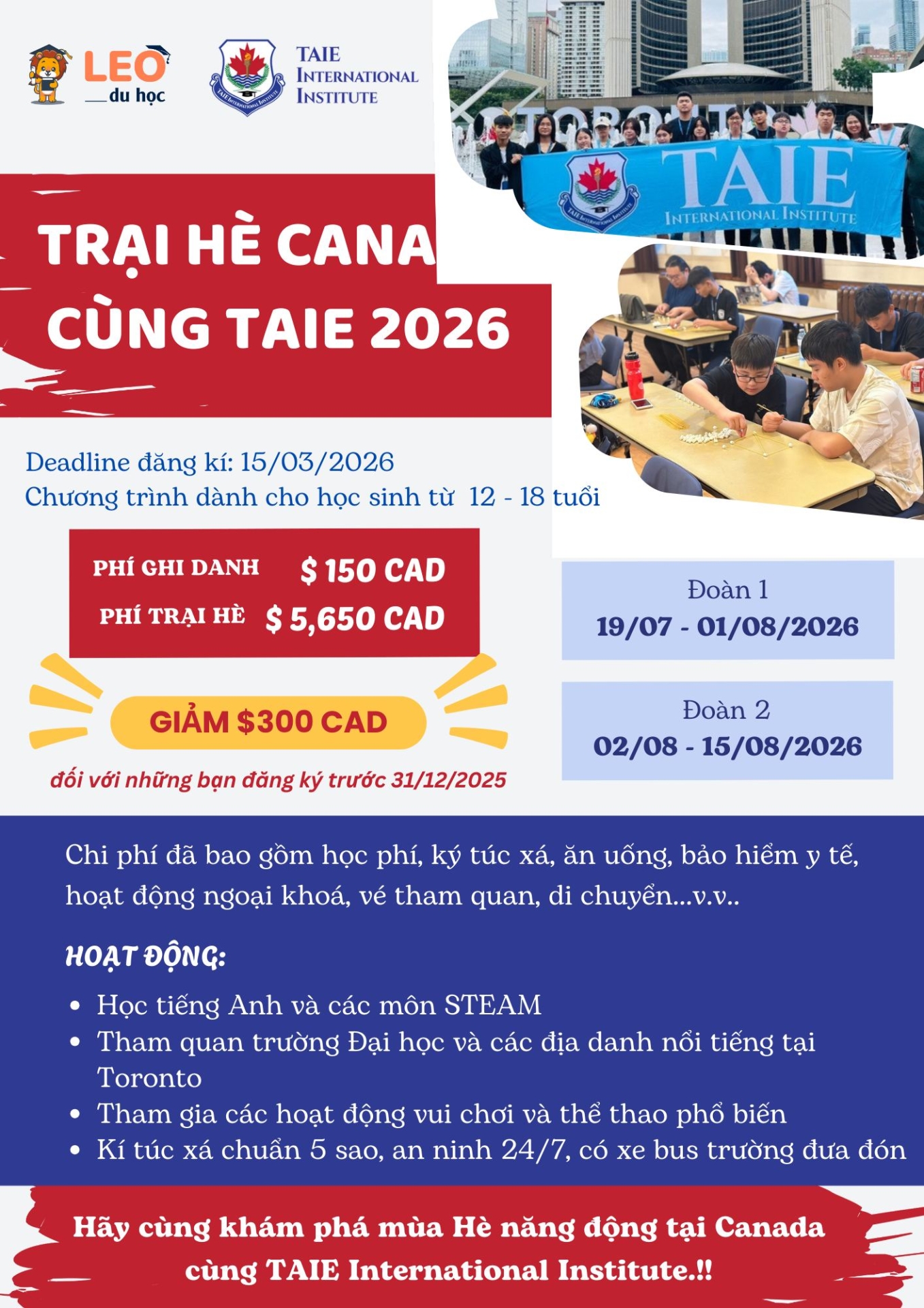 Mùa hè không chỉ là thời gian nghỉ ngơi mà còn là cơ hội để học sinh mở rộng tư duy, rèn kỹ năng và làm quen với môi trường quốc tế. Trại hè Canada 2026 tại Toronto do TAIE International Institute tổ chức là lựa chọn lý tưởng dành cho phụ huynh đang tìm kiếm một chương trình vừa học vừa trải nghiệm an toàn và chất lượng cho con.